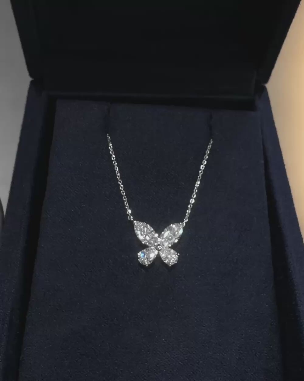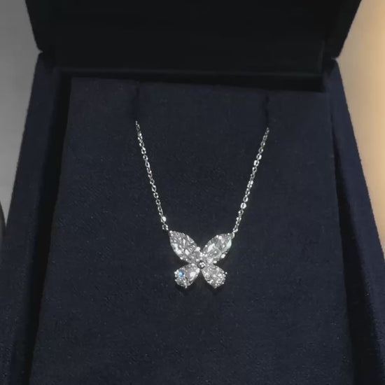 Pear-shaped and marquise-cut diamonds are precisely cut to create a delicate and beautiful butterfly shape. The wings of the butterfly shine gracefully under various light sources.
