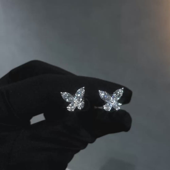 These stud earrings are designed as a butterfly, pear-shaped, and marquise.