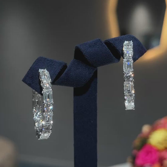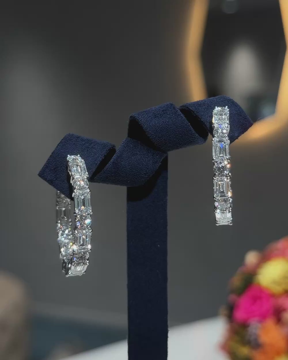 Hoop earrings featuring alternating emerald-cut and round brilliant diamonds. This exquisite piece allows you to enjoy the deep, clear radiance of the emerald cut alongside the powerful brilliance of Heart & Arrow round diamonds, creating a striking contrast of light.