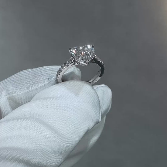 This is a simple heart diamond design with a pave band. Heart-shaped diamonds symbolize love and passion, and the delicate and elegant heart shape perfectly matches any outfit.