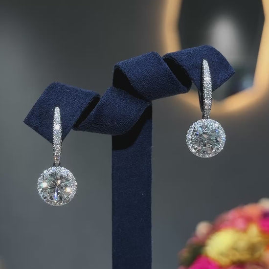 Gorgeous drop earrings with a D-color round brilliant center set surrounded by melee diamondsDclolor,VS1,IDEAL,IGI certificate includedYour piece can be tailored to your preference.Our concierge team will be delighted to assist you.