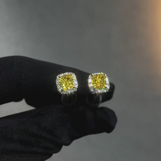 Stud earrings featuring vivid yellow cushion-cut diamonds surrounded by sparkling melee diamonds. Perfect for everything from daily wear to special occasions.