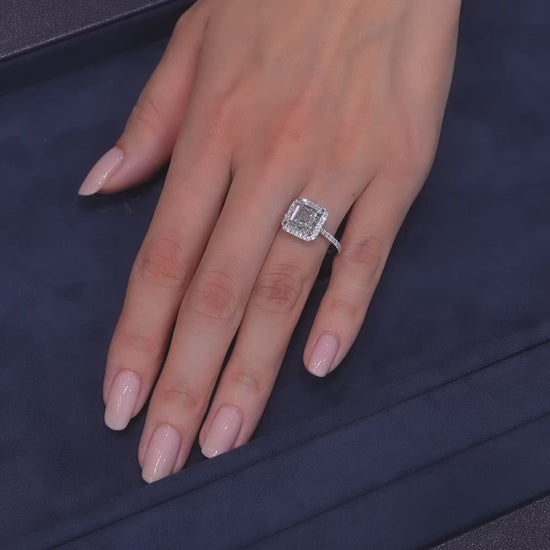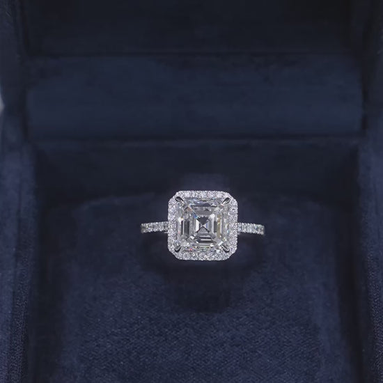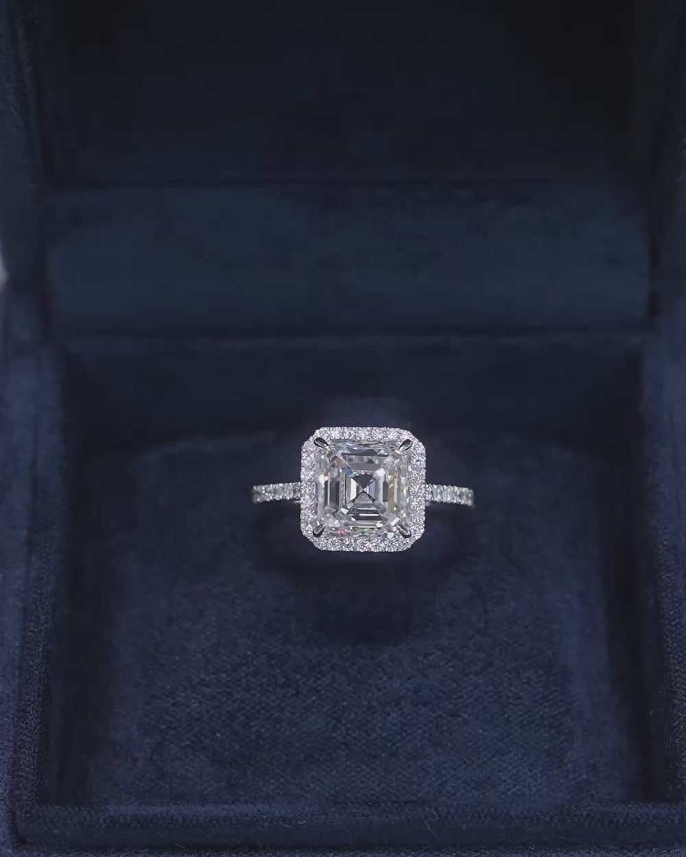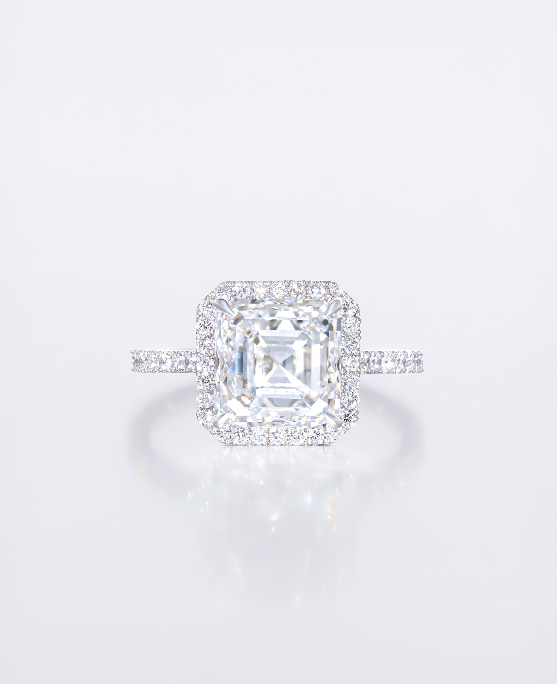 アッシャーカットダイヤモンドを繊細に取り巻いたHalo Ringです。アッシャーカットはステップカットのファセットが特徴で、クラシックな魅力と現代的な感覚を融合したデザインです。4ct以上のサイズはお問い合わせください。D,Ecolor,VS1,IGI鑑定書付属Lab Grown Diamond制作期間2ヶ月
