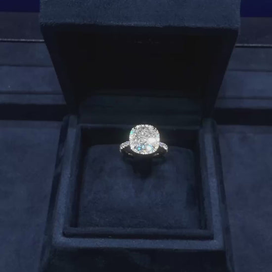 クッションカットをダイヤで取り巻き、アームから台座まで全てパヴェダイヤセッティングを施した贅沢なリングです。お好みの地金をお選びいただけます。Dcolor,VS1,IGI鑑定書付属お客様のご希望に合わせて、カスタムオーダーも承っております。まずはお気軽にお問い合わせください。