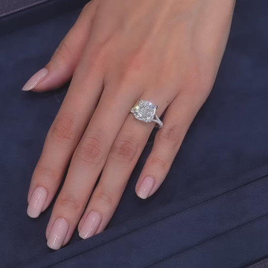 クッションカットをセンターにセット。その周囲に隠れたHALOセッティングを施しています。メインのクッションを取り巻き、横から見たときに美しい輝きを見せるデザインです。トップビューからはシンプルなソリテールのように見える一方、サイドからはエレガントな輝きが楽しめます。