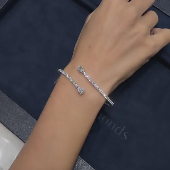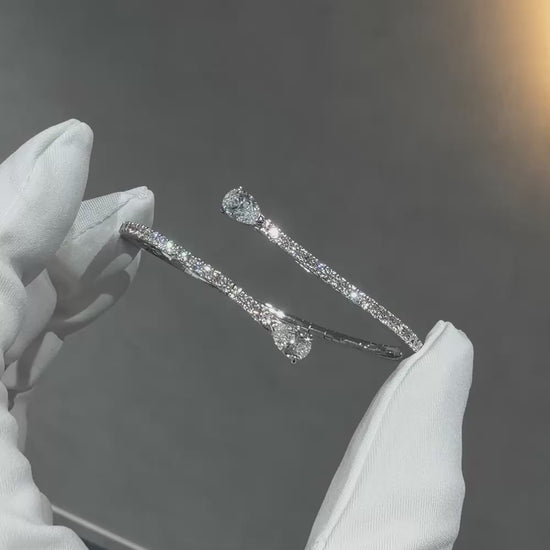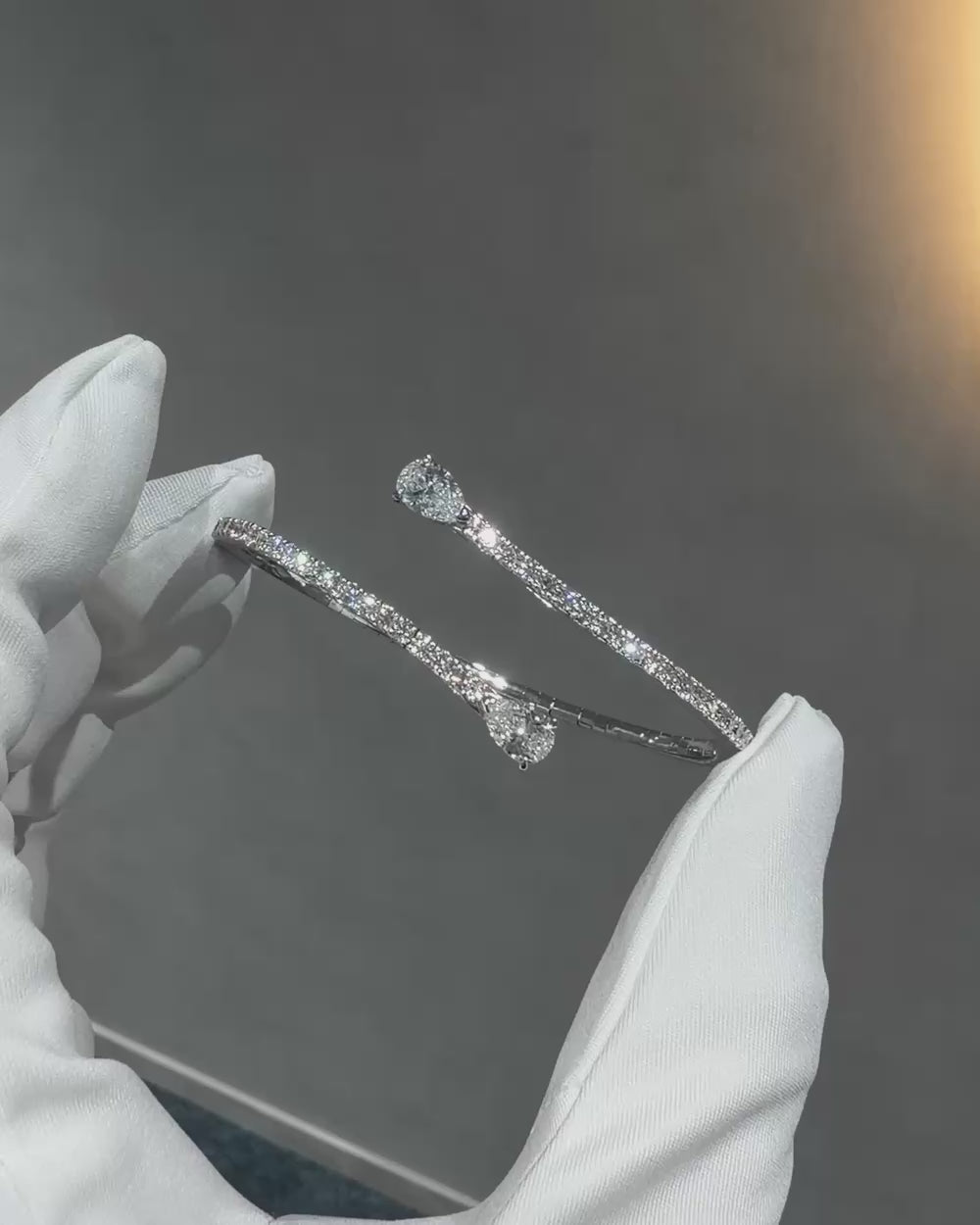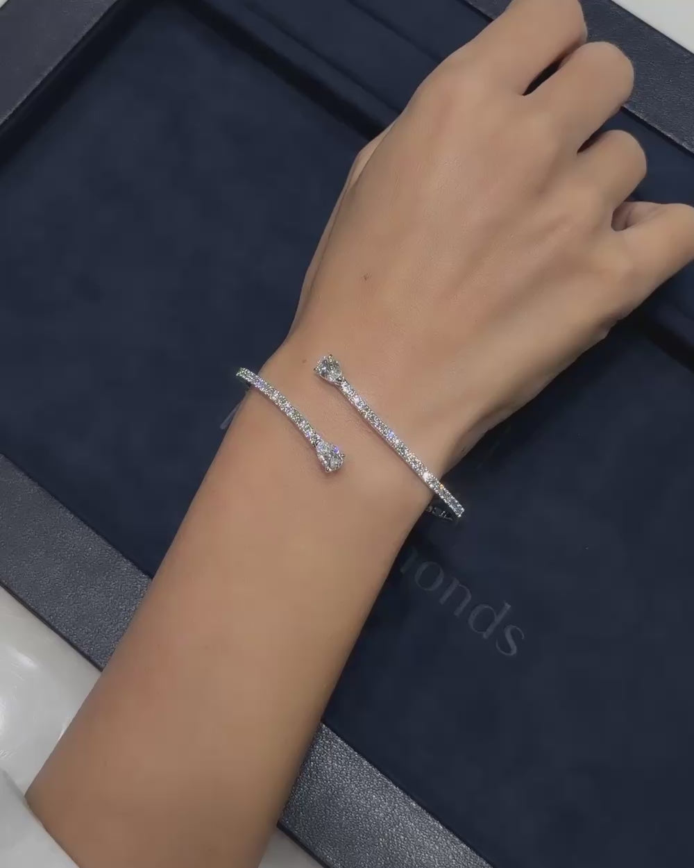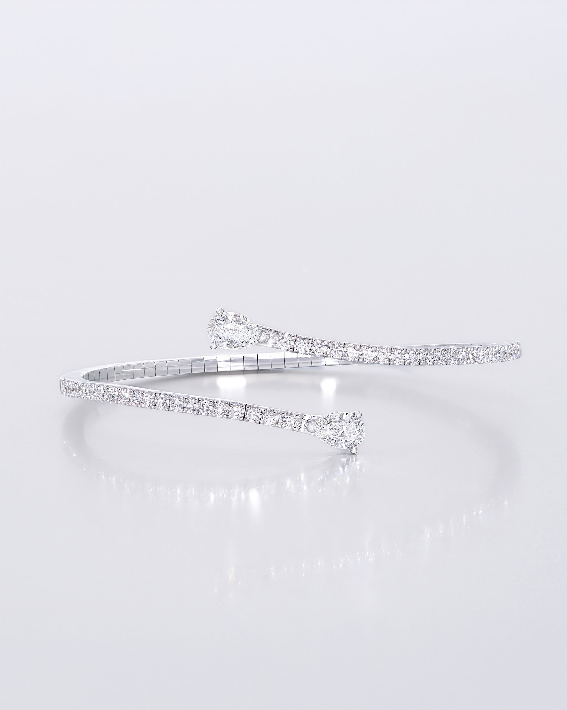 両端にペアシェイプダイヤモンドをあしらい、アーム全体にはハート&アローのダイヤモンドを贅沢にセットしたバングル。ペアシェイプの優雅な曲線と、H&Aの強い輝きが調和し、手元に華やかで洗練された印象を与えます。しなやかにフィットする構造で、動くたびに光が流れるように反射するラグジュアリーな逸品。サイズはお問い合わせください。Total 4ctLab Grown Diamond制作期間2ヶ月