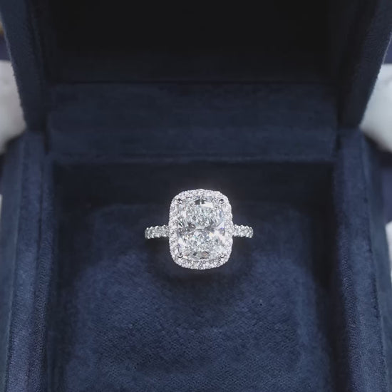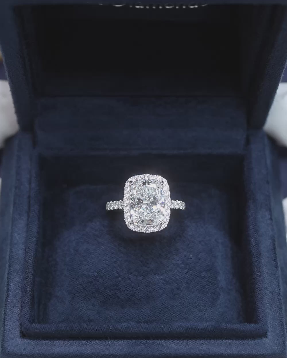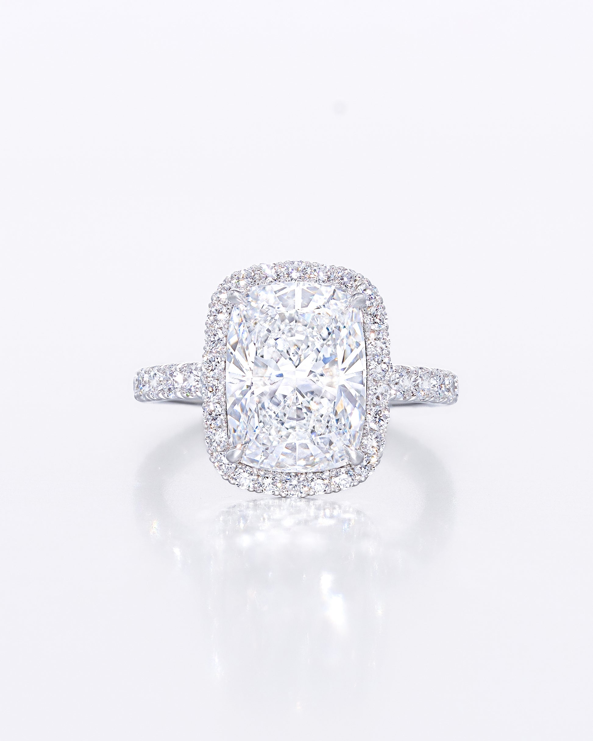 センターに存在感あるエロンゲイテッドクッションカットダイヤモンドを配し、その周囲を繊細なダイヤモンドで取り囲んだハローリング。縦長のフォルムが指を美しく見せると同時に、クッションカット特有の柔らかさを残し、優雅で洗練された印象を与えます。取り巻きの輝きがセンターストーンを一層引き立て、華やかさと気品を兼ね備えたデザインは、特別なシーンを彩るにふさわしい逸品です。