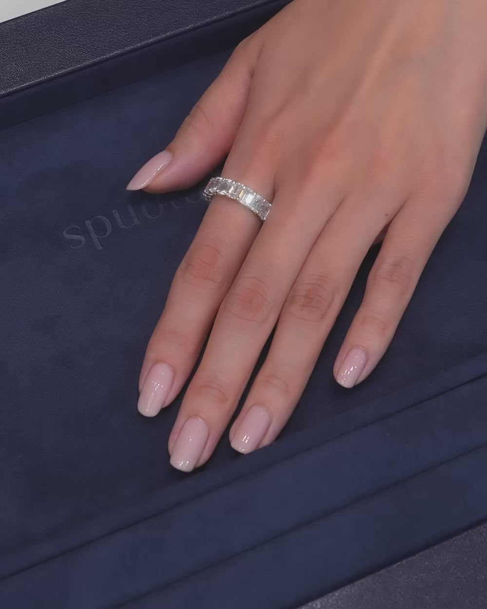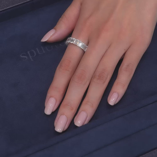 煌びやかな透明感と深みを持ち合わせたエメラルドエタニティリング。洗練されたデザインがどんな装いにも上品な光を添える逸品です。1石,0.4ct,幅5mm,D~Fcolor,VVS,VSLab Grown Diamond制作期間1ヶ月半