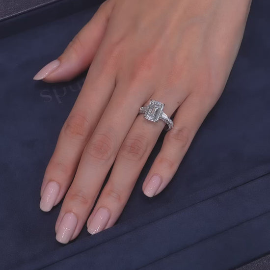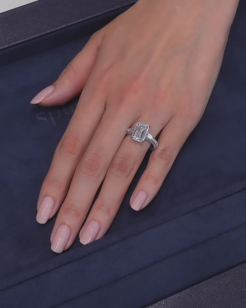 エメラルドカットを主役に、サイドにテーパーカット、アームの3方向全てに美しいラウンドカットダイヤモンドを精密にセットしています。センターのエメラルドカットは、その長方形のファセットが特徴で、奥深い輝きを放ちます。サイドのテーパーカットは、リングに流れるような線形の美しさを加え、全体のデザインを引き締めます。