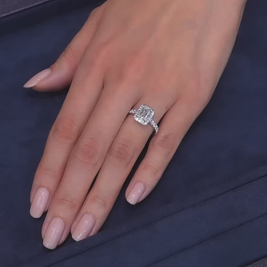 中央にエメラルドカットをセットし、周囲をハロー状にメレダイヤモンドで取り囲んだデザイン。バンド部分もパヴェセッティングが施され、全体が一層の輝きを放ちます。エメラルドカットのクリアな美しさとパヴェダイヤモンドの煌めきがお楽しみいただけます。