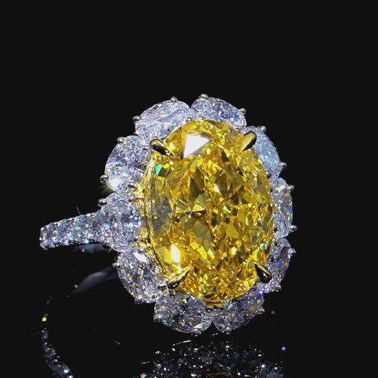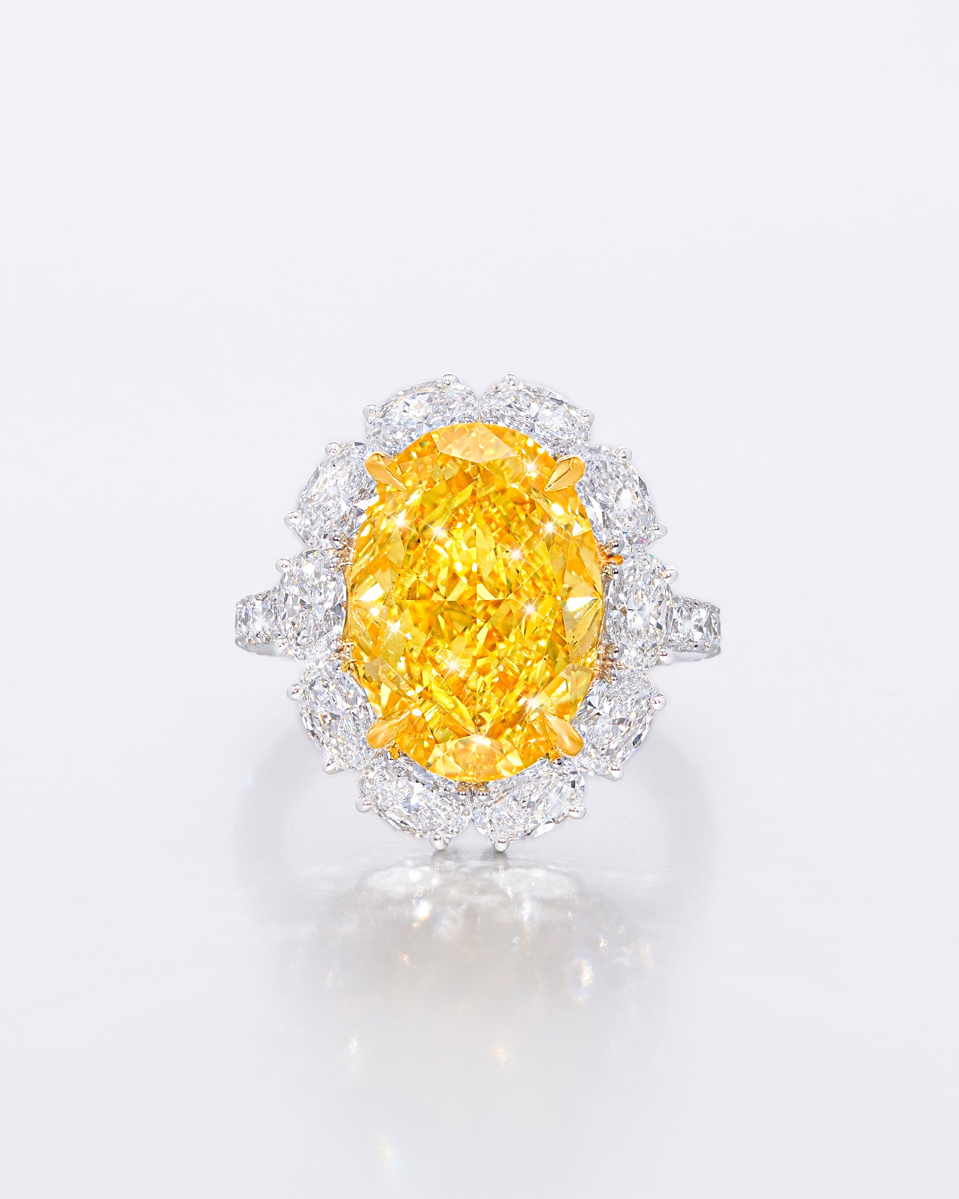 センターに鮮やかなイエローオーバルダイヤモンドを配し、その周囲をカラーレスオーバルカットダイヤモンドで贅沢に取り囲んだ豪華なリング。イエローの力強い彩りと、カラーレスダイヤモンドの透明感ある輝きが見事に調和し、指元に圧倒的な存在感を放ちます。