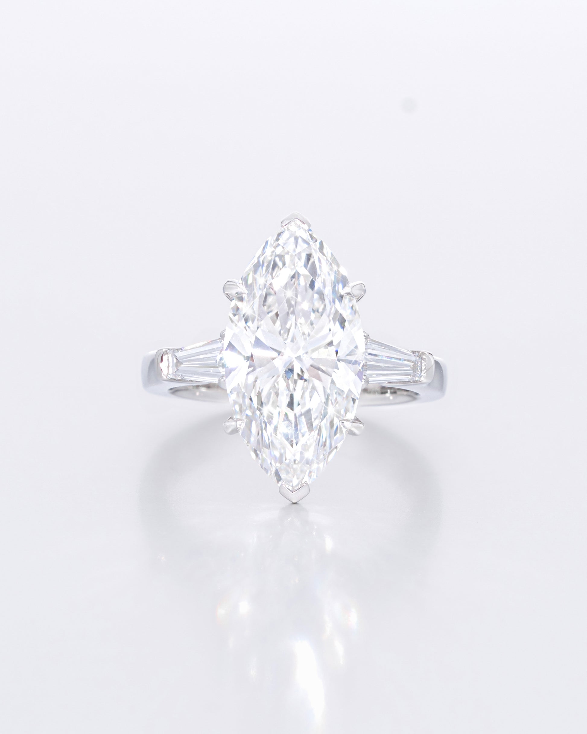 センターにマーキスカットダイヤモンドを配し、両サイドにテーパードバゲットダイヤモンドをセットしたエレガントなリング。マーキスの伸びやかなフォルムが指を美しく見せ、テーパードのシャープなラインが全体に端正なバランスをもたらします。クラシカルでありながらモダンな雰囲気を併せ持ち、存在感と気品を兼ね備えたデザインは、特別な日を彩るにふさわしい逸品です。