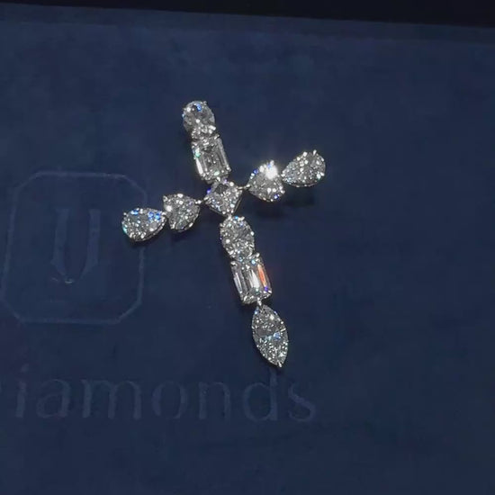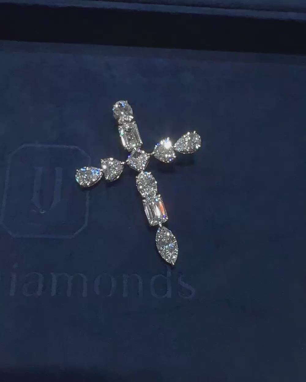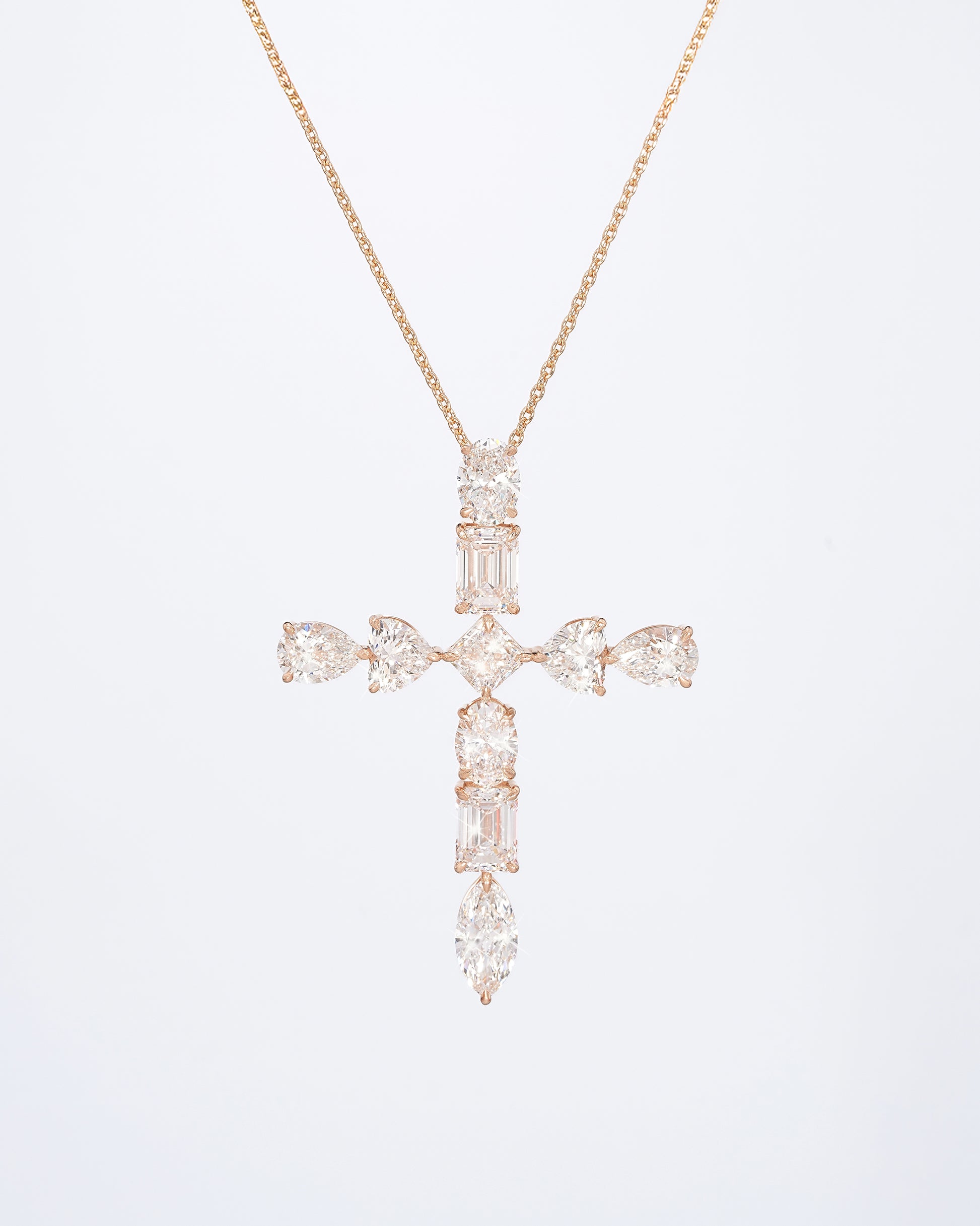 オーバル、エメラルド、プリンセス、マーキス、ハート、ペアシェイプの6種類のダイヤモンドを使用した特別なクロスネックレス。各シェイプの個性がひとつのデザインに調和し、立体的で表情豊かな輝きを放ちます。クラシカルなクロスモチーフに、多彩なカットが織りなすリズミカルな煌めきが加わることで、唯一無二の存在感を演出D~Fcolor,VVS,VS1,Lab Grown Diamond制作期間2.5ヶ月