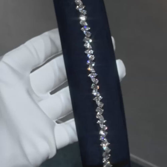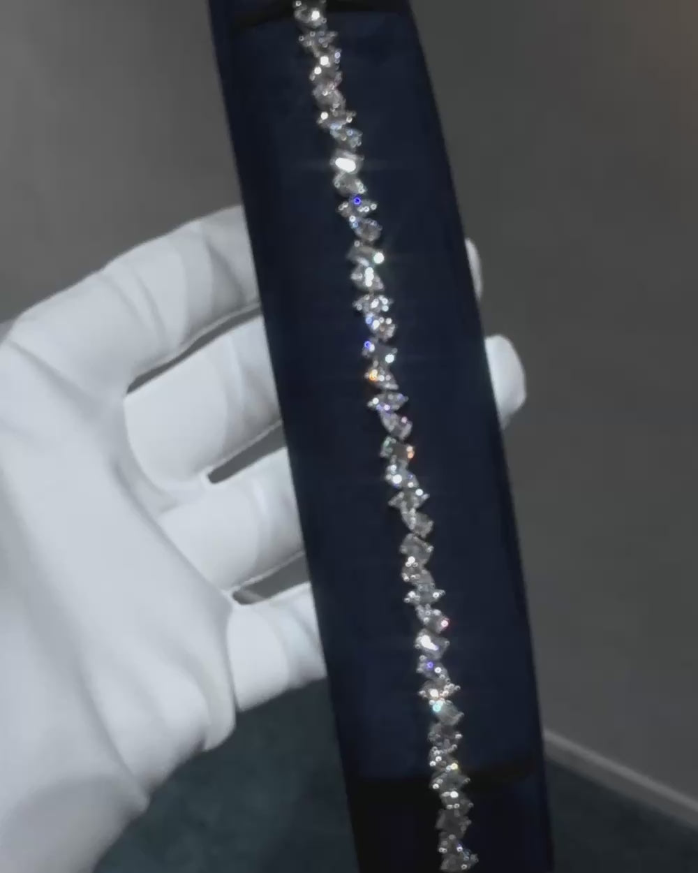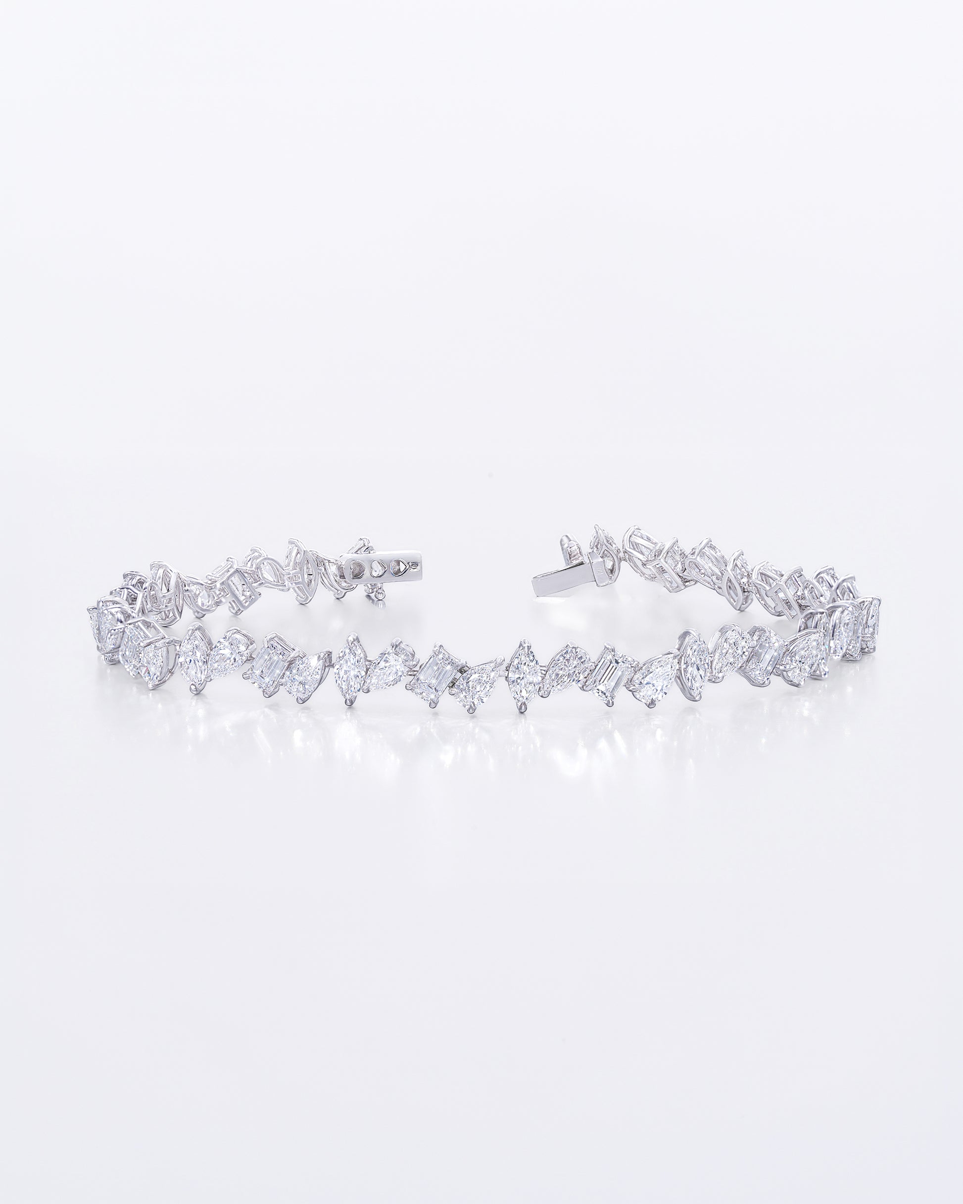 複数のシェイプのダイヤモンドを、斜めに流れるように配したブレスレット。異なるカットが手元に動きと奥行きを生み、洗練された中にもモダンな個性を感じさせるデザインです。お客様のサイズに合わせて製作いたします。オーダーご希望の際はお問い合わせください。D~Fcolor,VVS,VS1,お客様のご希望に合わせて、カスタムオーダーも承っております。まずはお気軽にお問い合わせください。