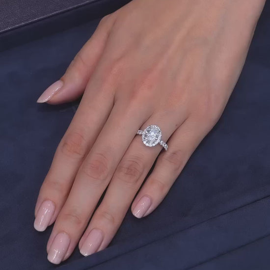 オーバルカットのダイヤモンドは指を細長くエレガントに見せる効果があり、HALOセッティングによりセンターストーンの輝きをさらに強調し、全体に豪華な印象を与えます。