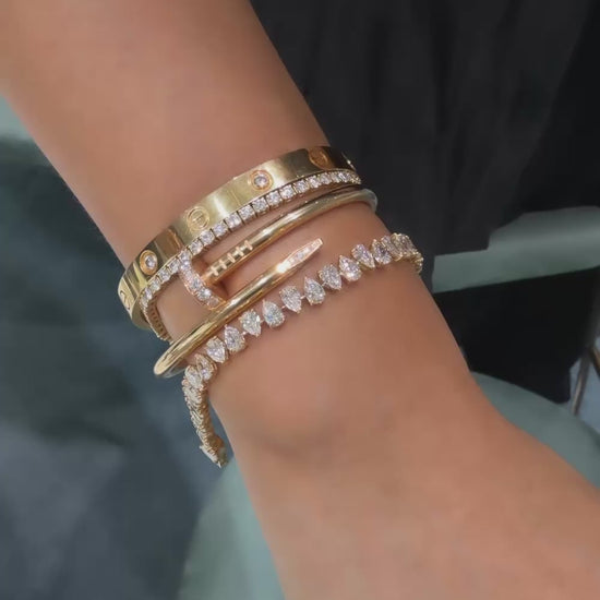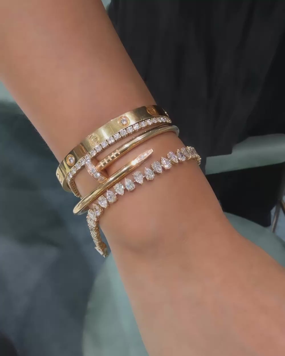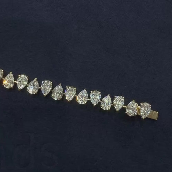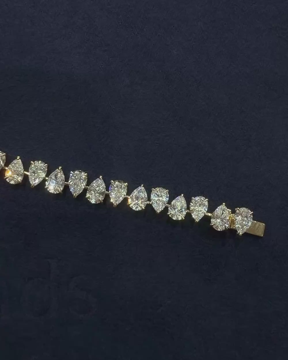 ペアシェイプのダイヤモンドを上下交互に配置した、リズミカルで洗練されたデザイン。涙型の優美なフォルムが光を柔らかく反射しながらも存在感のある輝きを放ちます。手元を軽やかで華やかに演出します。D~Fcolor,VVS,VS1お客様のご希望に合わせて、カスタムオーダーも承っております。まずはお気軽にお問い合わせください。