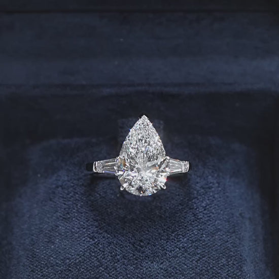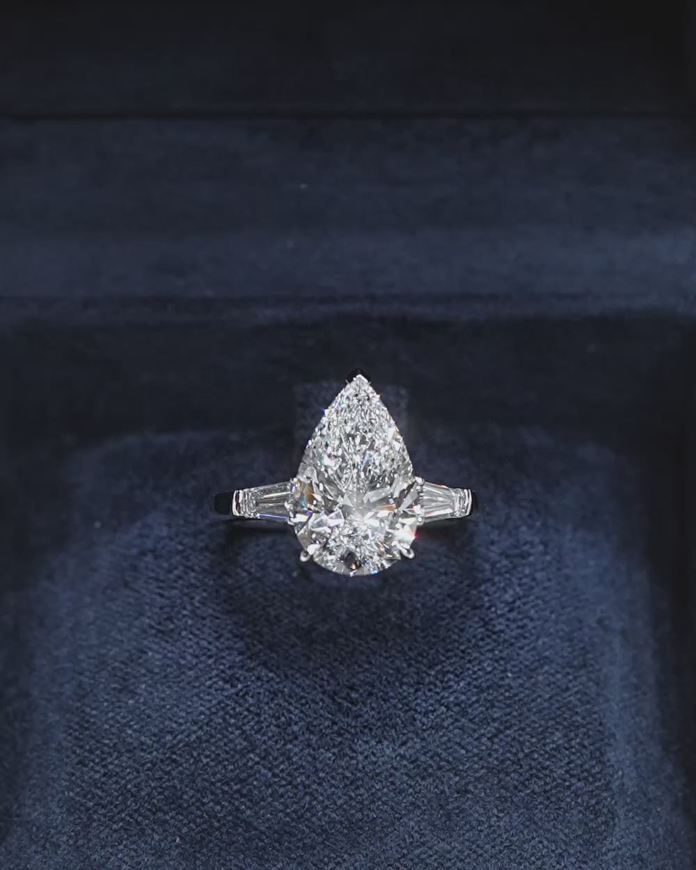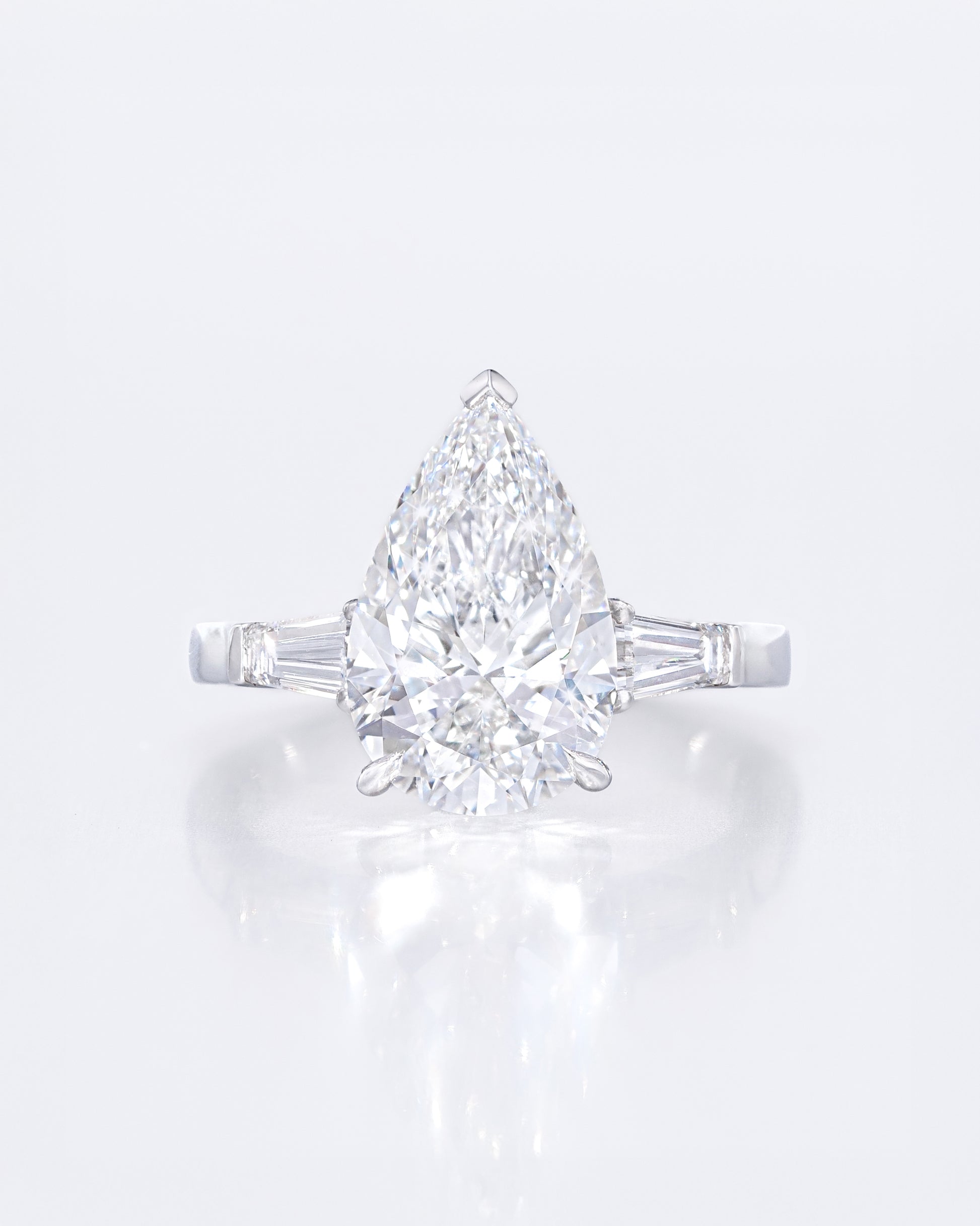 センターに優雅なペアシェイプダイヤモンドをセットし、両サイドにテーパードバゲットダイヤモンドを配した2ストーンリング。ペアシェイプの柔らかな曲線と、テーパードバゲットの直線的な輝きが見事に調和し、クラシックでありながらモダンな印象を与えます。