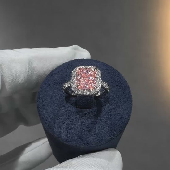 センターに華やかなピンクのラディアントカットダイヤモンドを配し、その周囲を繊細なホワイトダイヤモンドで取り囲んだエレガントなリング。