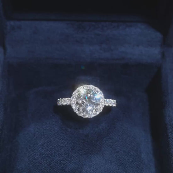 ラウンドブリリアントを大きめのメレダイヤで取り巻いたHaloデザインにパヴェバンド合わせた豪華なリング。華やかな煌めきはエレガントなディナーからカジュアルな日常まで、あらゆるシーンで手元を彩ります。Dcolor,VS1,IGI鑑定書付属お客様のご希望に合わせて、カスタムオーダーも承っております。まずはお気軽にお問い合わせください。