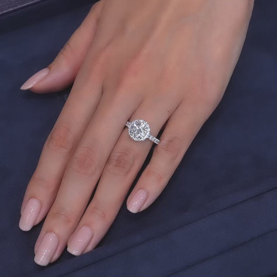 ラウンドブリリアントを大きめのメレダイヤで取り巻いたHaloデザインにパヴェバンド合わせた豪華なリング。華やかな煌めきはエレガントなディナーからカジュアルな日常まで、あらゆるシーンで手元を彩ります。