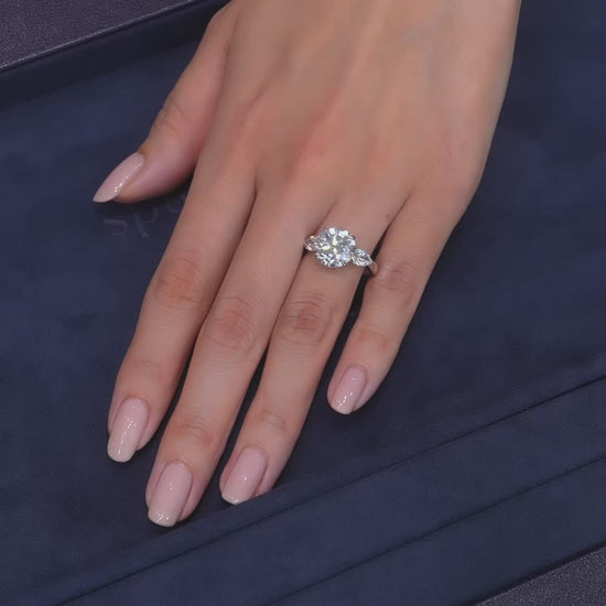 ラウンドブリリアントカットを中心に、両サイドにはエレガントなペアシェイプを添えています。流れるようなラインが全体的なデザインのバランスを美しく整えています。クラシックながらもモダンな感覚を表現し、どんな装いにも上品さと特別感を添えることができます。エンゲージメントリングや記念日の贈り物として、または自分への特別なご褒美としても最適な選択です。
