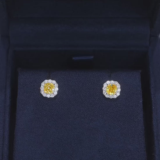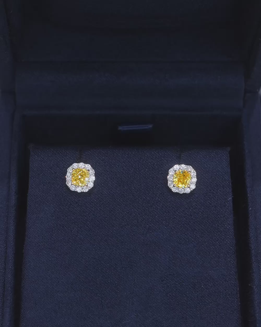 鮮やかなビビッドイエローのクッションカットをメレダイヤで取り巻いたスタッドピアス。日常使いから特別な日まで幅広いシーンで活躍します。Vivid Yellow Lab Diamonds Total 1.5ctPt950,K18YGTotal 1.8ct ※着画はTotal 1.8ct制作期間1ヶ月半