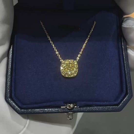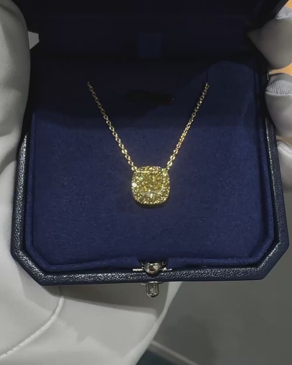 鮮やかなファンシーイエローのクッションカットダイヤモンドをセンターに配し、その周囲をイエローダイヤモンドで贅沢に取り巻いたネックレス。クッションカット特有の柔らかな輝きに、イエローダイヤモンドの華やかな彩りが重なり合い、温かみと存在感のある光を放ちます。チェーン長さ42cm,調整アジャスターカン40cm価格はお問い合わせください。Lab Grown Diamond