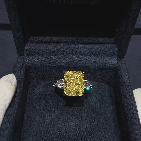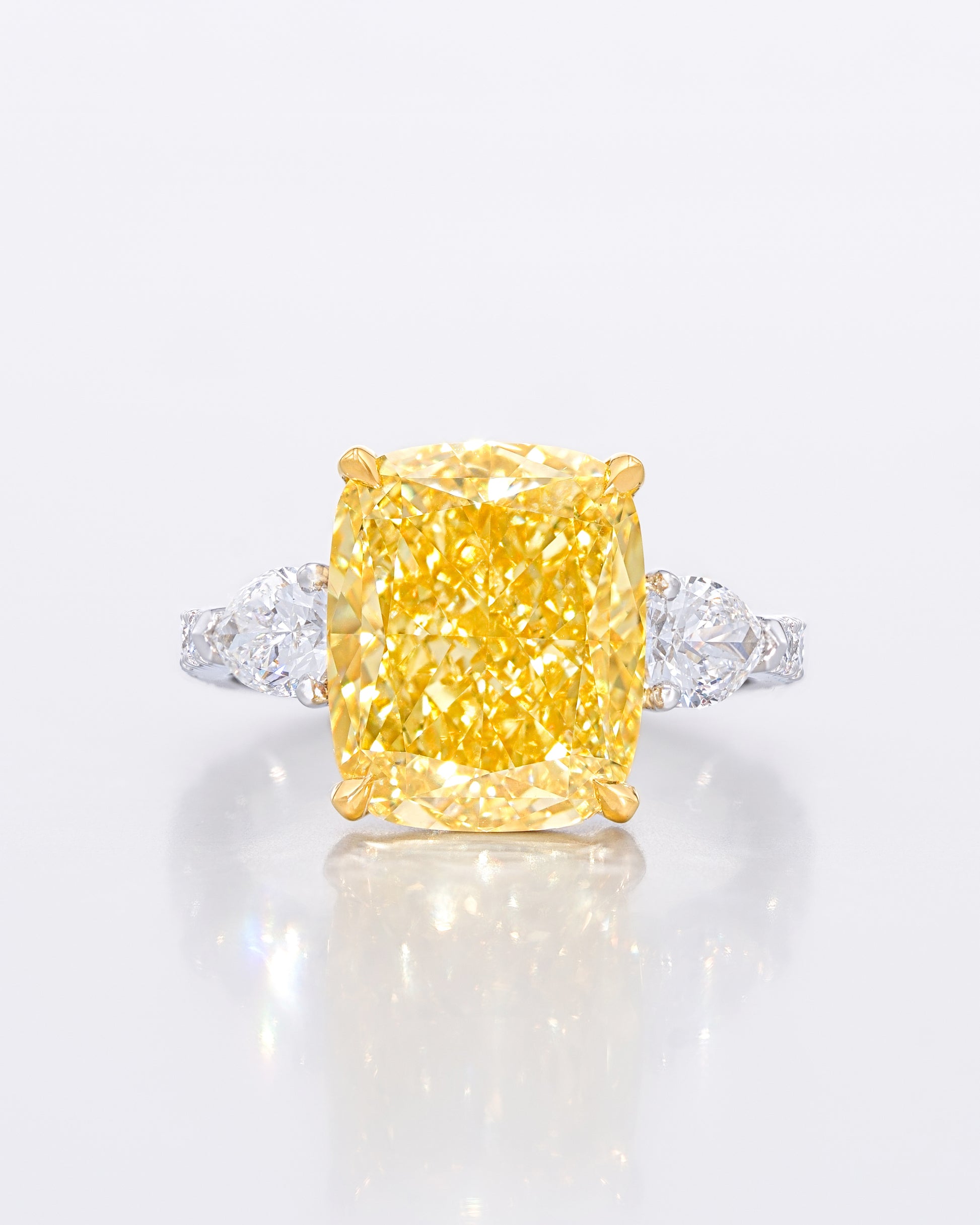 センターに鮮やかなクッションカットのイエローダイヤモンドを配し、両サイドにはホワイトのペアシェイプダイヤモンドをセット。さらにアーム部分には繊細なメレダイヤモンドを敷き詰めた、贅沢かつ調和の取れたデザインです。イエローダイヤの温かく華やかな輝きと、ホワイトダイヤの清らかな光が絶妙にコントラストを描き、指元を上品に照らします。クラシックとモダンを融合させた、洗練されたラグジュアリーリングです。お客様のご希望に合わせて、カスタムオーダーも承っております。まずはお気軽にお問い合わせください。